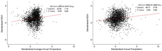 The second way to describe climate change was to use the normalized difference vegetation index (NDVI) as an indicator to quantify climate change (Xu Xinliang, China Annual vegetation index (NDVI)) spatial distribution data set. The data registration and publishing system of the resource and environmental science data center of the Chinese Academy of Sciences (http://www.resdc.cn/DOI, accessed on 6 June 2018) was used. Vegetation has been used as an “indicator” in global change research. Dynamic monitoring of vegetation has indicated trends in climate changes [33,34]. The NDVI reflects the proportion of effective radiation absorbed by vegetation. It is sensitive to the growth of vegetation and represents the changes in surface vegetation cover [35]. The NDVI index has often been used to estimate land cover area, vegetation photosynthesis capacity, vegetation biomass, regional evapotranspiration, soil water content and drought disaster [36]. Many studies have shown that the NDVI was significantly correlated with temperature and precipitation [37,38,39,40]. The NDVI contains both temperature and precipitation information, which has been used to describe the degree of climate change [41], and NDVI index better reflected the nonlinear and non-stationary complex change trends of certain factors [42]. Figure 2 shows the correlation between standardized annual temperature, standardized annual precipitation and the NDVI index from 2011 to 2019. There was a significant positive correlation among the standardized annual temperature, the standardized annual precipitation and the NDVI index. Therefore, the degree to which the NDVI was higher than the perennial value was used as an index to quantify the degree of climate change, that is: “(NDVI—perennial NDVI value)/standard deviation of NDVI”. Since the NDVI index could only be traced back to 1998, the perennial value and standard deviation were calculated based on the NDVI index from 1998 to 2010. According to the steps given in Equations (1)–(6), combined with the sample data, the estimated value of unsustainable livelihoods (Vsocial) was obtained. The descriptive statistical results for each of the variables are shown in Table 2: