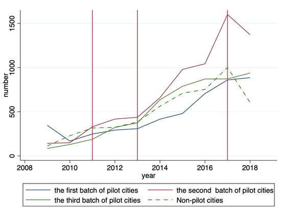 To use the difference-in-difference method to evaluate the policy effect, the control group and the experimental group must show the same change trend prior to the policy’s impact. Before the low-carbon pilot policy impact, enterprises’ green innovation trends in low-carbon pilot cities and non-pilot cities should be consistent. Therefore, prior to using the difference-in-difference method for estimation, a parallel trend test must be conducted to determine whether the change trend of the number of green patent applications of enterprises in the experimental group is consistent with that of enterprises in the control group before the implementation of the low-carbon pilot policy. In this paper, the green patent application data are aggregated according to the pilot batches, and the average value at the enterprise level is taken to replace the average value of green patent applications in cities. The mean value is taken as the vertical axis and the year as the horizontal axis to obtain the parallel trend test chart (as shown in Figure 1).