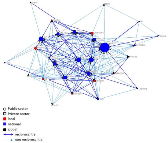 Figure 1 shows the entire collaboration network. Reciprocal ties are thick and colored dark blue, whereas non-reciprocal ties are thin and light blue. These distinctions help to illustrate a picture of the situation in the collaboration network. Figure 1 reveals that many relationships are not reciprocal, of which many come from the local and the private groups (see Table 6 and Table 7). As previously mentioned, this indicates that local actors are less likely to be considered as collaboration partners by national ones in the implementation of organic farming. Indeed, the national group certainly prefers to collaborate with actors of the same level. As a high betweenness centrality indicates the potential to play a broker role or act as a gatekeeper, and the size of the node indicates an actor’s betweenness centrality, Figure 1 reveals that especially national actors (blue) can occupy brokerage roles (e.g., the national actor MAG (Ministry of Agriculture and Livelihood). Therefore, it can be assumed that the implementation process of Law No. 8591 and Regulation No. 35242-MAG-H-MEIC, which represent the legal basis for developing and promoting organic farming in Costa Rica, is mainly performed at the national level. This situation could be interpreted as one reason for the slow implementation of such laws, which target land use and, therefore, local actors and aspects, in particular. Indeed, Regulation No. 29782-MAG provides the guidelines for farmers to produce organically, how to obtain certifications for their products and is the regulatory basis of the export arrangement of organic products with the EU. National authorities are probably well informed about certification and (corresponding) export requirements, but if they are not familiar with local circumstances, they risk excluding farmers from the opportunity to consider transitioning officially to organic farming. Particularly relevant here are aspects that involve costs (e.g., for certifications), for which the law and the regulation offer very vague transitional solutions or assistance.