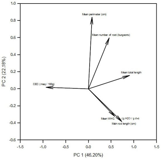 Biplot graph of the principal component analysis (PCA) for the variation of the following quantitative variables: WHC average (g H2O/g dw); CEC (meq/100 g); perimeter average (cm); number of roots (burgeons); average main rod length (cm); total length. ► Variable.