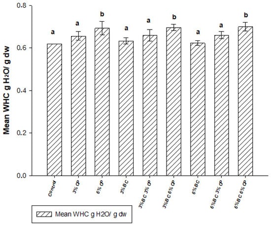 WHC average of different doses between biochar and bio-compost + standard deviation (n = 3); different superscript letters “a” and “b” represent significant differences between treatments at the p < 0.05 level; LSD value = 0.03. BC = biochar; CP = bio-compost.
