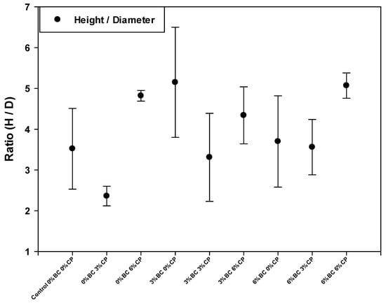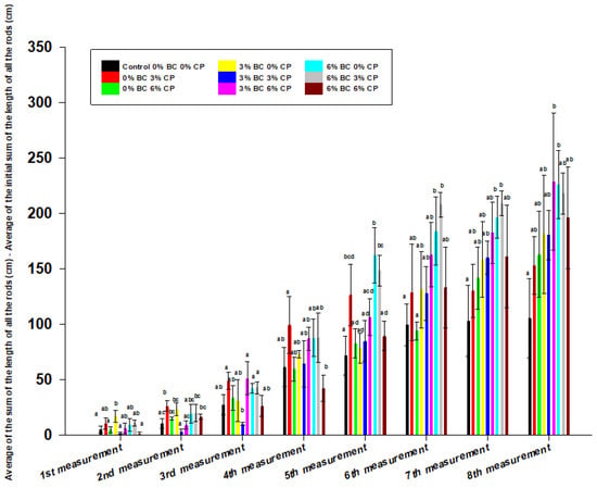 Average of the sum of the length of all the rods (cm)—average of the initial sum of the length of all the rods (cm) + standard deviation (n = 3). Different superscript letters “a”, “b”, “c” and “d” represent significant differences between treatments at the p < 0.05 level (a single common letter between two treatments means that there is no significant difference between these two treatments). ANOVA tests were made for each measurement separate from the others. BC = biochar, CP = bio-compost.