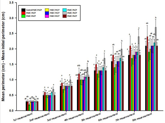 Mean perimeter (cm)—mean initial perimeter (cm) + standard deviation (n = 3). Different superscript letters “a” and “b” represent significant differences between treatments at the p < 0.05 level (a single common letter between two treatments means that there is no significant difference between these two treatments). ANOVA tests were made for each measurement separate from the others. BC = biochar, CP = bio-compost.