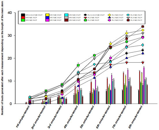 Number of buds generated after each measurement depending on the length of the main stem (cm), replication (n = 3). BC = biochar, CP = bio-compost, NR = number of buds, RL = length stem.