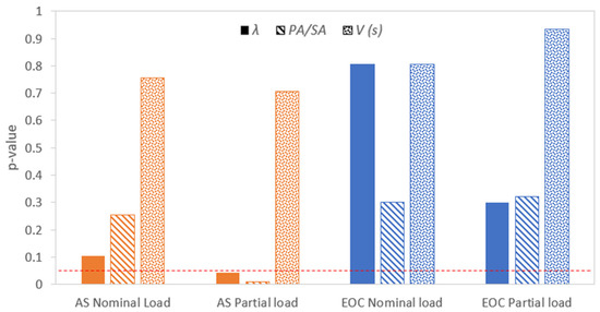 p-values for each load and biomass (dashed horizontal line: 0.05 significance level).