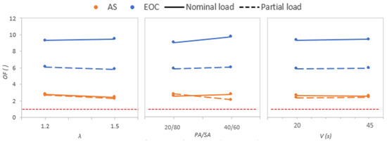 The statistical significance of each boiler factor on the OF was determined with the help of the p-value. The p-values for the two fuels studied and the two loads are shown in Figure 2, along with the critical p-value (0.05 in this study). This parameter allows for directly matching changes in the result (i.e., objective function) with a specific operating condition. Values below the critical one indicate statistical significance. Experimental tests for almond shells proved that λ and PA/SA were significant under partial load conditions (p-values 0.04 and 0.009, respectively). Large values of λ and PA/SA air ratio produced smaller values of the OF (Figure 3); although, emissions did not fulfil the standard limits (OF > 1), and further experimental tests were needed (stage 2). Although none of the operating conditions (factors) were statistically relevant for almond shells under nominal load conditions, the effects of λ and the PA/SA air ratio, (with p-values of 0.1 and 0.25, respectively) were more significant than that of the grate vibration frequency (p-value equal to 0.75). Since the best response for almond shells was observed for λ: 1.5 and PA/SA: 40/60 for partial load (~24 kW) and for λ: 1.5 and PA/SA: 20/80 for nominal load (~55 kW), these values were selected as starting point for stage 2.