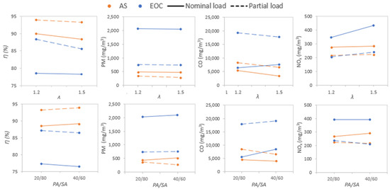 To provide additional information, Figure 4 shows the effects of the main significant operating conditions (λ and PA/SA) on the efficiency and pollutant emissions for both fuels. Results confirm the expected trends for biomass combustion; an increase in λ improves the combustion behavior by decreasing CO emissions (except for EOC nominal load) and PM emissions (in less magnitude), but also deteriorates the boiler thermal efficiency, because of the higher sensible heat losses [13]. Moreover, NOx emissions increased (slightly for AS) probably as a result of a better oxidation of fuel nitrogen [33]. Regarding PA/SA, the lower PA/SA air ratio (20/80), the lower CO and PM emissions for exhausted olive cake. Similar PM emission tendency for almond shells at nominal load was observed while CO emissions were slightly higher at a lower PA/SA air ratio. Probably, higher secondary air flow rate improved turbulence and promoted the volatiles oxidation in the secondary combustion zone (Figure 2). This positive effect on reducing emissions was also found by other authors [12,13]. However, both CO and PM emissions at partial load for almond shells were lower when higher a PA/SA air ratio was used. The lower air flow at partial load could reduce the air turbulence intensity and then higher primary air was needed for the fuel oxidation. Regarding the PA/SA air ratio effect on boiler efficiency, it increased for exhausted olive cake and it slightly decreased for almond shells when a lower PA/SA air ratio was used (in agreement with the CO and PM emission trends commented on above).