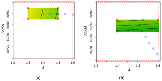 As shown in Table 3 and commented on above, since the OF for exhausted olive cake was higher than five, stage 2 (optimization) was carried out only for almond shells (nominal and partial load) by performing a factorial design for λ and PA/SA air ratio plus two central points at the given value suggested by stage 1, leading to the RSM results shown in Figure 5. For nominal load, λ values were limited by the boiler functionality (the boiler blower did not allow for values greater than 1.5) and, therefore, two λ values up to 1.5 were tested to find the RSM (Table 3).