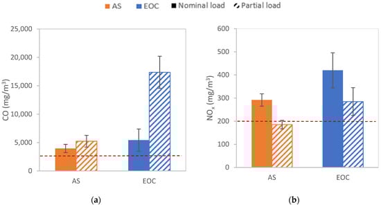 (a) CO and (b) NOx emissions for each load and biomass (dashed horizontal line: standard limits).
