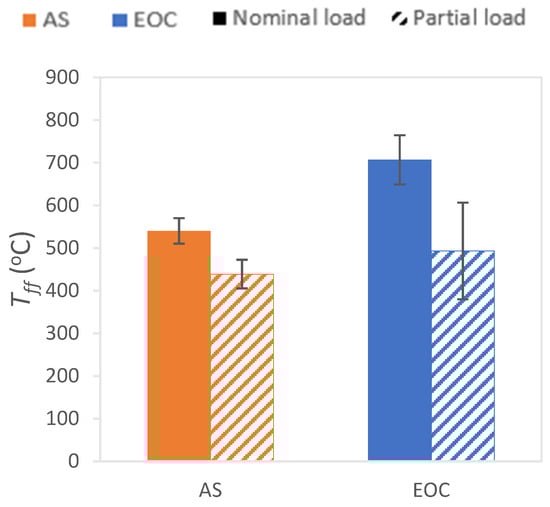 According to the previous results (higher CO emissions), the less efficient combustion at partial load also led to lower NOx emissions because of a poorer oxidation of the fuel (Figure 6b) [39]. On the other hand, higher NOx emissions for exhausted olive cake (Figure 6b) were probably due to its also higher elemental nitrogen (1.3%) [39,40] and the possible catalytic effect of its ash, which also could favor the NOx formation [41].