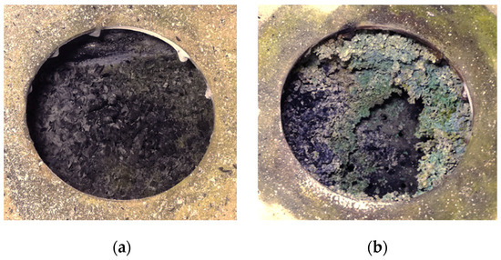 In addition, CO emissions were higher for exhausted olive cake because of its very significant ash content; the considerable accumulated ash in the fireplace may have reduced the diffusion of oxygen through the ash layer towards the carbonaceous residue [33]. It was remarkable to observe the higher Tff (Figure 7) for this biomass, which could have been due to the lower moisture content and also to a possible upward displacement of the combustion zone because of a thicker ash bed (Figure 8b) over the grate (which reduced the primary air supply as mentioned before).