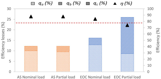 The efficiency loss due to sensible heat in gases (qa) was higher than that due to latent heat (qb) and unburned matter in solid residues (qc) for all fuels and loads except for the case of exhausted olive cake at partial load (Figure 10). For this latter case, a higher (qb) was obtained due to the significant incomplete combustion as commented in the previous section. For both fuels, the efficiency loss qa increased at nominal load because of the higher flue gas flow rate and flue gas temperature [21,22,23]. However, qb is directly related to the CO emissions, as expected (Figure 6a). Higher qb but lower qa was observed for almond shells at partial load, leading to similar efficiency at both loads (around 82%). As commented before, the higher qb for exhausted olive cake at partial load (even with lower qa at low load due to the lower Tcf achieved) led to a lower efficiency compared with nominal load. Therefore, the efficiency determined for this biomass only fulfils the UNE-EN 303-5 standard at nominal load.