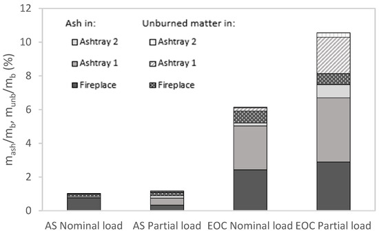 The distribution of solid residues, unburned and ash fractions (%) collected after each experimental test is shown in Figure 11. The residues were mostly formed by ashes (without unburned matter) independently of the fuel tested. As explained, exhausted olive cake ash content (8.9 wt.% d.b) led to a higher amount of residue in the fireplace (Figure 8b), as well as in ashtray 1 and ashtray 2. However, the ash content of residues of exhausted olive cake at nominal load was slightly lower than that of the fuel, which could be associated with the amount of fly ash carried up the chimney (high amount of particulate matter as shown in Figure 9). Regarding the unburned material, the largest amount was collected at partial load with EOC in ashtray 1 (2.8%) and consisted mainly of carbonized pellets that had been reduced in size (without burning) and were able to pass through the grate. A different grate design for this type of fuel could prevent the unburned material from passing through the ashtray. On the other hand, the unburned matter fraction for almond shells formed in the fireplace was below 1%.