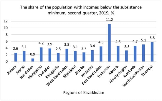 Analysis of the development and harmonization of society is implemented in the example of Kazakhstan. In 2019, the Address of the Head of the State K. Zh. Tokayev to the people of Kazakhstan, the section “A new stage of social modernization” noted that the country’s budget should be focused on sustainable economic development and solving social problems [9]. A new economy is being formed, i.e., industries with a high share of intangibles, human capital, information, communication technologies, education, science, and intellectual services (consulting) [10,11,12]. The synergetic relationship between technology, business practices, and economic policy leads to a rapid increase in productivity, and income, a decrease in unemployment, and moderate inflation [13]. The distinctive features of the new economy are dynamics, innovations, network economy [14], science, and mass customization. The nature of the upcoming changes is comprehensive [15]. Despite this fact, a sustainable economy is an ideal that countries aspire to. These circumstances determine the significance of this study, which addresses the issues of sustainable development and harmonization of society.