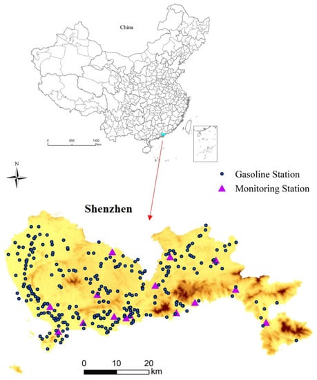 Shenzhen is a megacity in China that has experienced rapid economic development and urbanization, which have been accompanied by representative urban air pollution problems [30,31]. It consists of nine districts with a total area of 1997.47 km2. The national and local governments have adopted a series of measures to reduce air pollution, and the air quality has subsequently improved significantly. However, the situation of ground-level ozone pollution is not positive [15]. Ground-level ozone exposure poses a severe threat to the health of residents [30]. According to the data released by the Municipal Bureau of Ecology and Environment, VOC emissions from gasoline stations are one of the important factors causing ground-level ozone formation, making ground-level ozone become the primary air pollutant in summer in Shenzhen [32,33,34]. As shown in Figure 1, the gasoline stations are mainly concentrated in the western part of Shenzhen, which is also the most densely populated area of the city. In recent years, the number of motor vehicles in Shenzhen has increased sharply. Car ownership in Shenzhen exceeded 3 million by September 2021, leading to rapid growth in gasoline sales. Thus, the Shenzhen Municipal Bureau of Ecology and Environment issued a notice encouraging gasoline stations to adopt preferential economic policies to guide car owners to fuel at night to reduce VOC emissions. The city also strengthened the special detection of oil vapor recovery at gasoline stations to ensure that emissions meet standards.