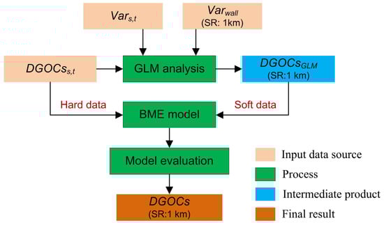 As described in Figure 2, a BME model incorporating the outputs of a GLM was utilized to retrieve the daily GOCs at a 1 km spatial resolution (). The method consists of two main modules: a GLM analysis and a BME model. The and represent the daily average concentrations and auxiliary variables of monitoring site on day , respectively, and represents the high spatial resolution (i.e., 1 km) auxiliary variables. The , and were used as a data source, and the daily GOCs of each eligible grid point () was the intermediate product.