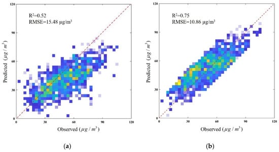 We performed a 10-fold cross-validation to test the predictive ability of the concentration retrieval models. The monitoring datasets were randomly divided into 10 equal-sized subsets. Each of the subsets served exactly once as the source of validation samples. The models were constructed using the monitoring data from the remaining subsets. We then used the trained models to make predictions for the validation samples. This procedure was repeated until each measurement had the corresponding prediction value. The coefficient of determination (R2) and root mean square error (RMSE) were used as the assessment indices.