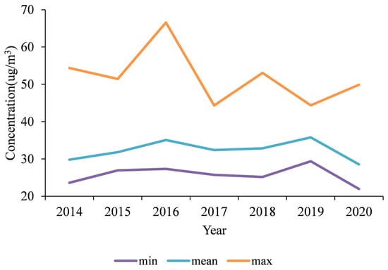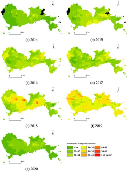 Using the daily GOCs, we calculated the 1 km seasonal average GOCs in Shenzhen for summertime during 2014–2020 (Figure 5). As shown in Figure 5, the summertime average concentrations showed significant spatial heterogeneity and an overall trend of high values in the middle and low values in the west. The areas with the highest summertime average concentrations were mainly concentrated in mid-southern Shenzhen. The summertime average concentration ranged from 28.54 to 35.78 µg/m3 during the study period. The summertime average concentrations mainly showed an upward trend from 2014 to 2019, followed by a downward trend in 2020. They were roughly the same in 2016 and 2017.