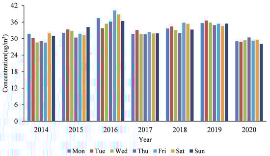 We calculated the daily GOCs at gasoline stations in Shenzhen for the summertime during 2014–2020. The weekly variation in daily GOCs at gasoline stations is illustrated in Figure 6. There is an obvious weekly periodic variation in GOCs at gasoline stations [15]. From 2014 to 2020, the daily GOCs at gasoline stations were higher on Monday, Tuesday, Friday and Saturday. Typically, people travel by car on weekends, driving longer distances than they would normally travel to work. To prepare for the trip, they fill up their fuel tanks (i.e., Friday or Saturday), contributing to high levels of GOCs at gasoline stations. To account for weekend gasoline consumption and weekly commuting trips, people usually fill up on Sunday or during the beginning of the week (i.e., Monday and Tuesday), depending on their needs. These factors help to explain the periodic change in the weekly variation in the daily GOCs [20,50]. In addition, gasoline stations in Shenzhen usually launch preferential activities on Tuesday and Friday to entice drivers to fill up, which also contributes to the relatively high GOCs of gasoline stations on these days. In 2020, Shenzhen launched a special campaign to crack down on the illegal operation of refined oil products and comprehensively monitor the vapor recovery process, thereby improving the quality of oil vapor products [51]. The demand for gasoline also decreased due to the COVID-19 pandemic. With the decrease in oil vapor pollution, the GOCs at gasoline stations also decreased in 2020. In addition to reducing unnecessary outings, people chose to refuel in the middle period of the week (i.e., Wednesday and Thursday) to support daily work and life. These are some of the reasons for the high levels of GOCs at gasoline stations during these days.