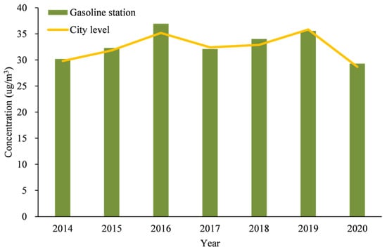 The mean values of the daily GOCs at the citywide level and gasoline stations for the study period are illustrated in Figure 7. As shown in Figure 7, the mean value at the citywide level showed an upward trend from 2014 to 2016. It fell in 2017, and then continued to rise until 2019. It reached the lowest value of 28.68 µg/m3 in 2020. According to Figure 7, the mean value of GOCs at gasoline stations in Shenzhen is slightly higher than the citywide average level for summertime 2014–2020, with the exceptions of 2017 and 2019.