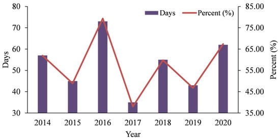 We calculated the percentage of days when the daily average GOCs at the gasoline stations exceeded the city’s average level for the summertime during 2014–2020 (Figure 8). Figure 8 shows that the daily average GOCs at the gasoline stations are higher than the citywide average level on more than half of the summer days for multiple years. Among them, 2016 was the most pronounced, with the daily average GOCs at the gasoline stations exceeding the city’s average level on nearly 80% of the days. In 2017, this phenomenon eased, but the percentage of days when the daily average GOCs at gasoline stations exceeded the city’s daily average level still reached approximately 40%. In 2020, although the overall level of GOCs decreased for both the city overall and the gasoline stations (Figure 7), the former was higher than the latter on nearly 70% of the days. In general, the potential risk caused by ground-level ozone exposure at gasoline stations is more pronounced than the citywide average level.