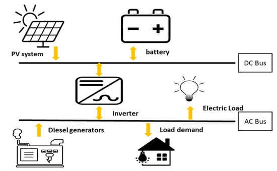 In this work, a hybrid system composed of battery, PV panel, and Diesel Generator (DG) is applied which is shown in Figure 1. As shown in Figure 1, there are two buses, including AC (alternative current) and DC (direct current), which connect the system via inverter. DC is connected to the AC bus, while battery and PV are linked to the DC bus. Since the consumed energy is alternating current, the load is linked to AC bus. The aim of the study in the first stage is to analyze the effect of five tracking systems on the NPC and LCOE and subsequently performing sensitivity analysis.