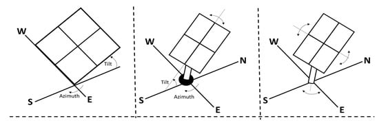 The majority of the PV panels are installed on fixed systems which receive the most energy in midday hours. These systems have some advantages in terms of simplicity of the structure and cost; however, tracking systems are able to produce greater power in other hours. In this regard, the main advantage of tracking system is their ability in receiving solar energy in the highest duration in a day. Tracking systems are categorized based on their rotating axes, which are shown in Figure 2. Six tracking systems are explained as follows []:
