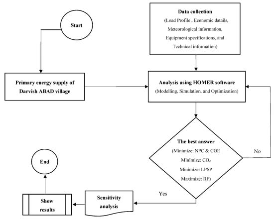 In Figure 3, schematic of HOMER software is depicted. The aim of this study is to supply the primary energy of a village, Darvish Abad, in South Khorasan, Iran. First of all, it is needed to gather the required information. Afterwards, HOMER software is applied to model, optimize, and simulate the system. The most appropriate option must follow four objective functions. If the best option is in accordance with the defined objectives, sensitivity analysis is performed, else, the initial stages are repeated to reach the best option bases on the defined objective function.