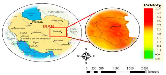 Currently, most of the world energy demand is supplied by fossil fuels such as oil products, coal, and natural gas []. There are several problems related to the utilization of these fuels such as fluctuations in their price, greenhouse gas emission, and limitation in their resources [,,]. Increase in the cost and the economic challenges related to excessive use of fossil fuels has caused more attention to the renewable energy sources [,,]. Different renewable energies such as hydropower, solar, biofuels, geothermal, and wind are applicable for supplying the required energy of human activities. Among the renewables, solar energy is the most abundant one [,,]. Iran, with around 300 sunny days per year in more than 2/3 of its region and mean radiation of more than 5 kWh/m2·day, is introduced as one of the countries with considerable potential in terms of solar energy. These features make solar energy for power generation an efficient solution for supplying annual energy demand and dependency on fossil fuels []. Regarding the economic subjects such as the cost of network, fuel price, transmission cost, and hard-to-reach geographical areas, it is not possible to install proper infrastructure in remote rural areas and connect them to the grid. In these cases, applying solar technology for power supply is an appropriate way to produce power from renewable energies [,]. Some renewable energy technologies such as photovoltaic (PV) cells are not able to produce power in a continuous way and require a backup system in order to supply the power in case these systems are not active or produce power inadequately. To resolve the issues related to the fluctuations in the energy sources, different hybrid energy systems, composed of two or more technologies, are applied; furthermore, these systems are able to decrease the levelized cost of energy (LCOE) and emission of greenhouse gases [,,]. Hybrid Energy Systems have been modeled and optimized for different purposes [,,,,], while the ones composed of PV cells and storage units are very conventional for the residential sector [].