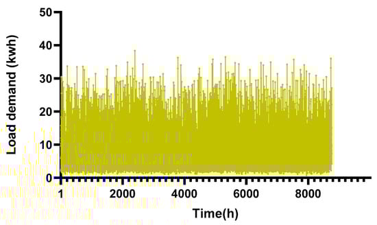 This work investigates an off-grid village which is located at 32° and 53 min latitude and longitude of 59° and 13 min. Local electrical energy is supplied by the power plants feed with fossil fuels. In Figure 5, the long-term average of summation of generated power by PV is shown. The electricity demand of ordinary households is depicted in Figure 6, which includes refrigerator, washing machine, TV, vacuum cleaner, lamp, computer, and steam iron. The present case study includes 37 households with average income and four family members, with daily electricity demand of 233.10 kWh and maximum load of 38.38 kWh. In the simulation, peak load is considered in July. As shown in Figure 7, time series data are obtained from HOMER software and the annual load is 85,081.5 kWh.