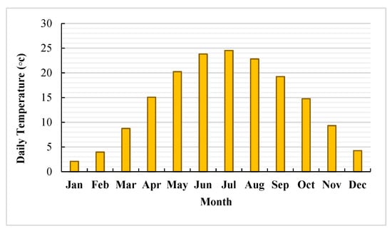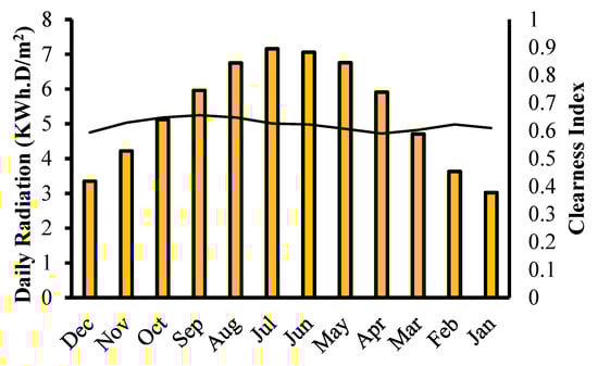 - Solar radiation: solar radiation is in the range of 3.02–7.16 kWh/m2·day, while the average annual solar radiation for the case study is 5.30 kWh/m2·day, which is shown in Figure 8. Between April and September, Global Horizontal Irradiance (GHI) is higher than average value and its peak value is in June. Solar radiation in other months, especially November, December, and January, is relatively low [].