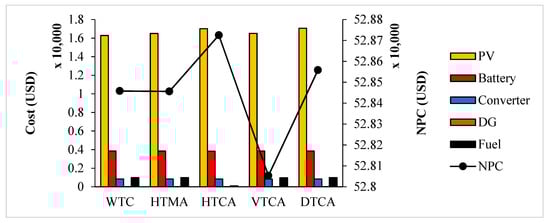 According to Figure 10, VTCA and HTCA have the minimum and maximum NPC, respectively. According to this figure, NPC of the hybrid systems with WTC, HTMA, HTCA, and DTCA are 0.076, 0.075, 0.12, and 0.095% higher than the system with VTCA. In all of the systems, PV has the highest contribution in the cost which is followed by battery, fuel, and inverter, respectively.
