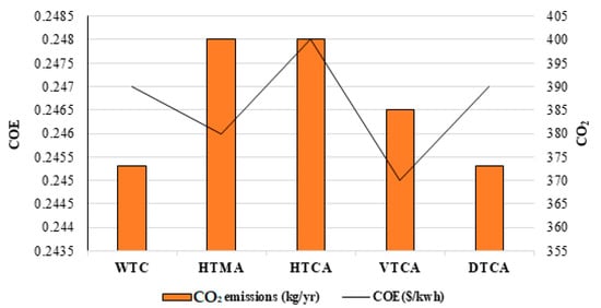 In Figure 11, emission of carbon dioxide and COE related to the investigated systems are shown. It shows that HTCA has the highest emission, mainly due to the DG operation hours, while the minimum emission belongs to VTCA. COE of the systems with WTC, HTMA, HTCA, and DTCA are 0.81%, 0.4%, 1.22%, and 0.81% higher than VTCA, respectively.