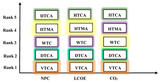 - The hybrid system with VTCA has the lowest NPC, while the ones with HTCA has the highest value of NPC. NPC of the systems with WTC, HTMA, HTCA, and DTCA are 0.076%, 0.075%, 0.12%, and 0.095% higher than the system with VTCA. The hybrid system with VTCA has the lowest emission;