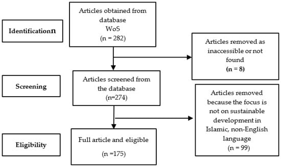 The research question guides the search strategy and the review protocol as illustrated in Table 1. The search was based on papers published in English in the Web of Science during 1990–2021. Moreover, other databases were used in the review including Science Direct, Pro Quest Central, EBSCO, and Google Scholar to ensure wider coverage and triangulation. The review used the key words “sustainable development AND Islamic”. The rationale for selecting this timeframe is guided by the era that the SDGs process was initiated and marked the global environmental agenda. The global agenda and sustainability discourse was initiated in this era and prior to the SDGs in 1995, which includes the Earth summit and global fora. The review excludes conference proceeding papers, master’s theses, doctoral dissertations, textbooks, and unpublished working papers. Web of Science (WoS) (accessible at www.WoS.com (accessed on 3 March 2022) provides the electronic database for the review. WoS is one of the world’s largest online databases of peer-reviewed scientific publications and is adequate for SLR [23] and it is regarded as a comprehensive and quality database [24]. Furthermore, it also has a wide network of peer-reviewed literature [25]. The protocol for review is presented in Appendix A.