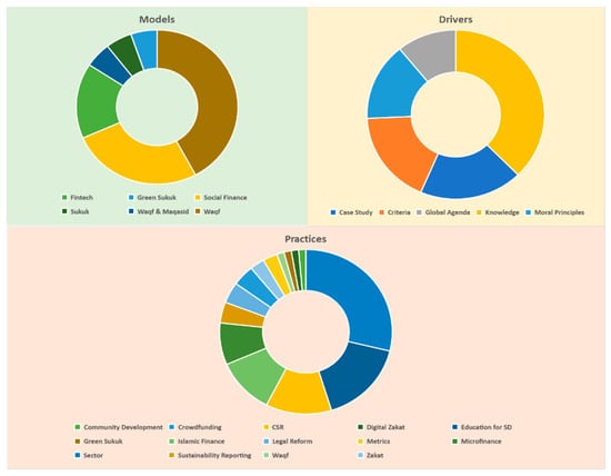 For articles addressing sustainability models, the main models include adoption of fintech, sukuk and green sukuk, social finance, and waqf. Articles that focus on practices encompass domains including community development, crowdfunding, CSR, digital zakat, education for sustainable development (SD), green sukuk, Islamic finance, legal reform, metrics, microfinance, sector, sustainability reporting, waqf, and zakat while articles identified as drivers include case study, criteria, global agenda, and moral principles, as shown in Figure 5.