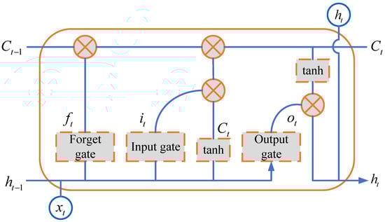 A Long Short-Term Memory (LSTM) network is an extension of a Recurrent Neural Network (RNN) [58]. The LSTM network contains one input layer, one output layer, and several hidden layers; its structure is shown in Figure 1. The key to the LSTM network is the cell state; and are the old state and new state of the cell, respectively. In an LSTM, the information about the cell state is censored by the gate structure, which allows for selective passage of information. It consists of a sigmoid neural network layer and a pairwise multiplication operation. The sigmoid is a nonlinear activation function and is contained in the gate structure. The gate structure output ranges from 0 to 1 and defines the degree of information passing through. The tanh layer in Figure 1 is an activation function that maps a real number input to the range [−1, 1].