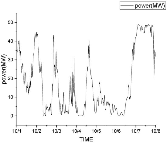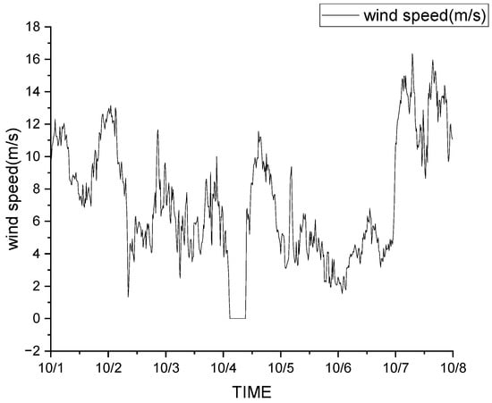 The experimental sample dataset used in this paper consisted of time series data of wind power from 1 October 2019 to 30 October 2020 provided by a domestic power station. The series of environmental factors has six columns, including the weather forecast data (humidity, temperature, air pressure, air density) obtained by the corresponding environmental monitors and the actual data (wind direction, wind speed) measured by the wind tower in the actual field. The observation points are forecasted at 15 min intervals, which is in line with actual production operation changes. Due to observation errors and communication failures in the actual operation of the power station, the observation dataset needed to be cleaned; “bad data” with null values and abnormal values were eliminated on a per-day basis to obtain the experimental observation dataset. The observation time period was 24 h throughout the day, the observation interval was 15 min, and there were 96 data observation points per day. The variables included in each dataset were the 24-h weather forecast data, the field wind tower actual measurement data, and the actual wind power data, as shown in Table 1. Finally, 35,586 sets of time section data were obtained. The original wind power time series and the environmental factors (in terms of wind speed) time series are shown in Figure 2 and Figure 3.
