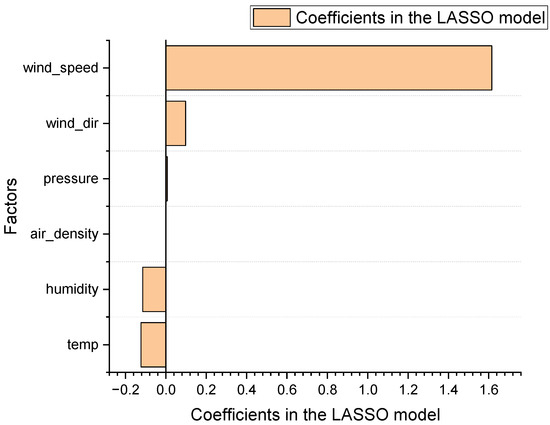 First, the input series of humidity, temperature, pressure, air_density, wind_dir, wind_speed, and power were normalized by their maximum–minimum values according to Formula (12). In this paper, the penalty parameter, , in the LASSO method was determined by three-fold cross-validation, at which value LASSO kept five variables and filtered one variable with a coefficient of zero, as shown in Figure 4.