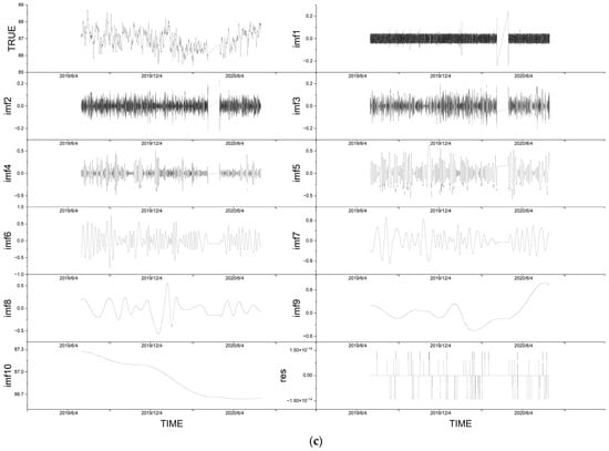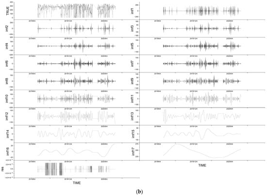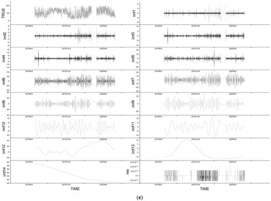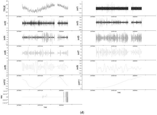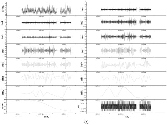 In Formula (9), is the residual, indicating the average trend in the signal, while is the j-th IMF, j = 1, 2,…, n, which denote the different components of the signal from high to low frequencies, respectively.