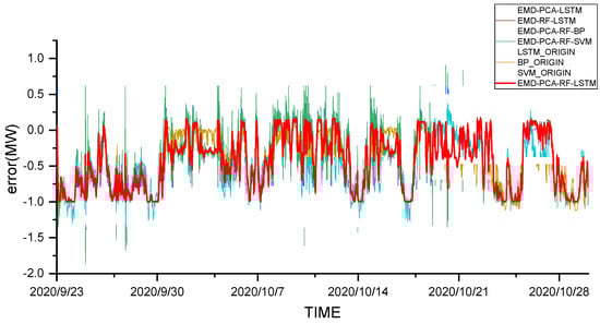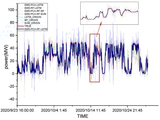 In order to verify the superiority of the EMD-PCA-RF-LSTM wind power forecasting model proposed in this paper, the effectiveness of EMD decomposition, and the necessity of PCA-RF dimensionality reduction, as well as to show that the combined forecasting model proposed in this paper can significantly enhance and improve the accuracy of wind power forecasting, three forecasting models, namely, LSTM, EMD-PCA-LSTM and EMD-RF-LSTM, were used for forecasting. In addition, the model proposed in this paper was compared with two classical time series forecasting models, namely, a BP (back propagation) neural network and an SVM (Support Vector Machine), while using EMD-PCA-RF for data decomposition and dimensionality reduction. The comparison of the models is shown in Figure 8.