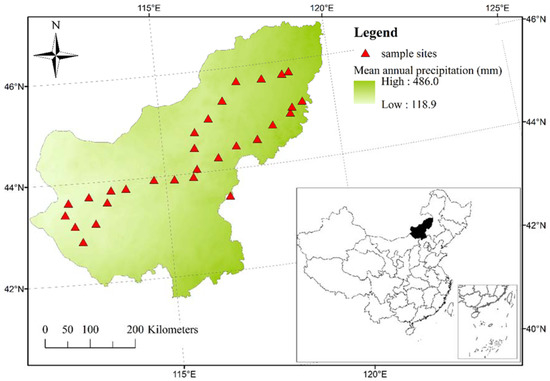 Plant samples were obtained from 29 grassland sites in the Xilingol League (111°25′–119°58′ E and 41°35′–46°46′ N), Inner Mongolia, China (Figure 1). The terrain of this area is high in the south and low in the north, with elevation ranging from 778 to 1957 m a.s.l. [24]. The area is characterized by a temperate continental arid and semi-arid climate with mean annual temperature (MAT) ranging from −3 to 6 °C and mean annual precipitation (MAP) ranging from 118.9 to 486 mm (Figure 1). Most precipitation is in summer, accounting for about 80% of the annual precipitation, and there is a significant negative correlation between MAP and MAT (r2 = 0.74, p < 0.001). Zonal soils are chernozems, kastanozems, calcisols, luvisols and arenosols; intrazonal soil are cambisols, gleysols, solonchaks and solonetz [24]. The main grassland types are temperate meadow steppe, temperate typical steppe and temperate desert steppe. The dominant species of temperate meadow steppe are Stipa grandis, Stipa baicalensis and Leymus chinensis; the dominant species of temperate typical steppe are Stipa krylovii, Stipa grandis, Leymus chinensis, Agropyron cristatum, Artemisia frigida, Cleistogenes squarrosa, Salsola collina and Caragana microphylla; and the dominant species of temperate desert steppe are Stipa klemenzii, Artemisia frigida and Cleistogenes songorica [23].