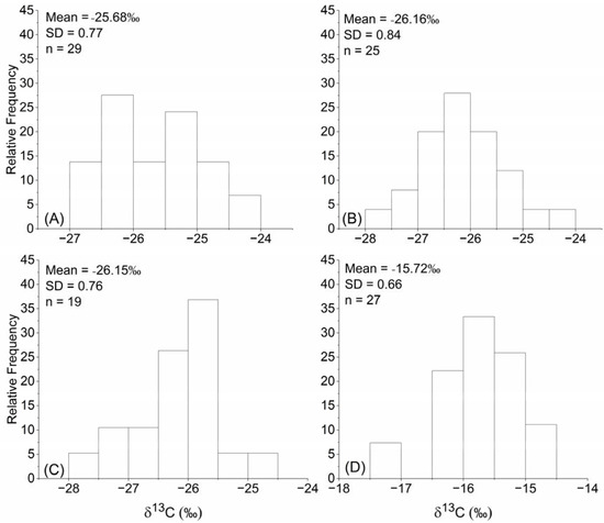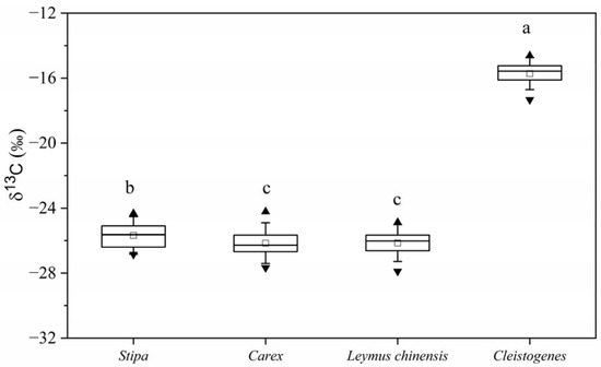 Plant δ13C of Stipa spp. (C3) ranged from −26.85‰ to −24.33‰ with an average value of −25.68‰ ± 0.77, and 65% of these values were within the range −26.5 to −25% (Figure 2A). Plant δ13C of Carex spp. (C3) ranged from −27.67‰ to −24.22‰ with an average value of −26.16‰ ± 0.84, and 68% of these values were within the range −27 to −25.5% (Figure 2B). Plant δ13C of Leymus chinensis (C3) ranged from −27.89‰ to −24.88‰ with an average value of −26.15‰ ± 0.76, and 63% of these values were within the range −26.5 to −25.5% (Figure 2C). Plant δ13C of Cleistogenes spp. (C4) ranged from −17.33‰ to −14.62‰ with an average value of −15.72‰ ± 0.66, and 81% of these values were within the range −16.5 to −15% (Figure 2D). Previous studies have found that the range of plant δ13C for C3 and C4 plants are from −35‰ to −20‰ and from −19‰ to −9‰, respectively [25,26]. Thus, the ranges of plant δ13C of Stipa spp., Carex spp. and Leymus chinensis were all within the range found for C3 plants, and the range of plant δ13C of Cleistogenes spp. was within the range found for C4 plants. The plant δ13C of different plant species were significant different (p < 0.001). The plant δ13C of Cleistogenes spp. was significantly higher than that of Stipa spp., Carex spp. and Leymus chinensis; the plant δ13C of Stipa spp. was significantly higher than that of Carex spp. and Leymus chinensis; there was no significant difference between the plant δ13C of Carex spp. and Leymus chinensis (Figure 3).
