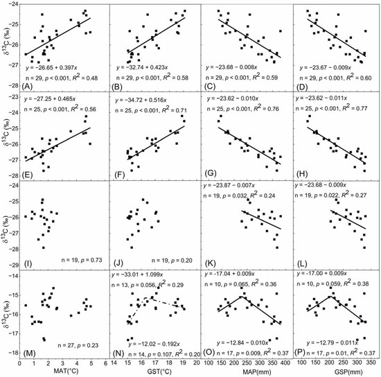 The relationships between plant δ13C and climatic factors for (A–D) Stipa spp., (E–H) Carex spp., (I–L) Leymus chinensis and (M–P) Cleistogenes spp. MAT, mean annual temperature; GST, growing season temperature; MAP, mean annual precipitation; GSP, growing season precipitation. Black squares represent data points; lines represent regression fitting lines.