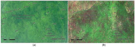 (a) Landsat Imageries of Kainji Lake National Park, 1972. (b) Landsat Imageries of Kainji Lake National Park, 1986. (c) Landsat Imageries of Kainji Lake National Park, 2015. Source: Maps adapted and modified from The U.S. Geological Survey, https://eros.usgs.gov/westafrica/biodiversity-protected-areas, (accessed on 1 December 2021).