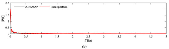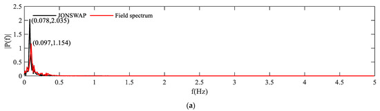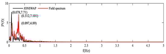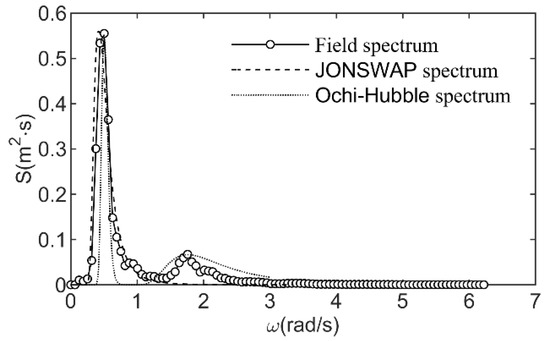 The spectrum curve of the maximum wave height is shown in Figure 2. The measured effective wave height H1/3 is 1.58 m, and the spectrum peak period Tp is 13.15 s. The average wave period is 5.96 s. An improved JONSWAP spectrum [29] and a dual peak Ochi-Hubble spectrum [15] were used to fit the field spectrum. Among them, the peak enhancement factor γ of the improved JONSWAP spectrum is 0.95, and can be expressed as follows: