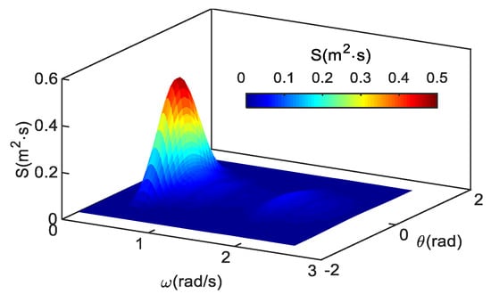 The SWOP (Stereo Wave Observation Project) directional spectrum [31] is used as the directional target spectrum for typhoon wave simulation, and the distribution function is shown in Equation (9). In theory, −π < θj < π, but in fact that the energy of the waves is mainly distributed in the range of π/2 on both sides of the main propagation direction, so the number of equally divided angles only on −π/2 < θj < π/2 is M = 30. Assuming that the frequency spectrum and the directional spectrum are mutually independent. The wave spectrum considering the directional spectrum can be obtained by multiplying the two and then superimposing, and the formulas of wave spectrum are expressed in Equation (10) and directional spectrum is shown in Figure 4. With considering the directional spectrum Equation (12), the wave surface and the motion of three-dimensional water particles (Equations (13) to (14)) can be obtained by superimposing the cosine waves in M directions.