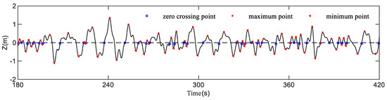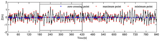 In order to verify the correctness of the three-dimensional typhoon waves based on the field spectrum, the changes in the wave surface at fixed points x = 0 m and y = 0 m over a period of 840 s were extracted, and the effective wave height and average period of the wave surface were calculated by the upward zero-crossing method. The maximum and minimum points of the random wave surface determined by the method and the duration curve of wave surface at the coordinate (0, 0) are shown in Figure 5. The wave height of a single cycle results from the adjacent maximum point minus the minimum point, and the wave period is the subtraction of two adjacent maximum points (or the subtraction of two adjacent minimum points). Figure 5 shows an enlarged view of the black wireframe part of the above picture. Since ωi and εi are randomly generated in the model, the random wave elements generated at the fixed points are tested by continuous calculation for ten times, as shown in Table 1.