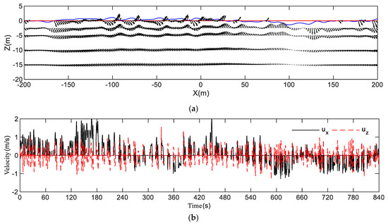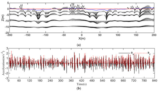For small-scale marine structures (structure characteristic length/wavelength <0.2), the Morison equation can be used to calculate the drag force and inertial force of the structure and to obtain the motion response of floating and suspended structures [32]. To simulate the motion response of small-scale structures under the action of typhoon waves, the calculation of the velocity distribution field and acceleration distribution field of the water particles are the key points. The velocity vectors of water particles on the X-Z plane at five water depths (z = 0, −2.5, −5, −10, −15 m) were obtained by using the Equation (13), where y = 0 m, and the positive direction of the X-axis is the main wave propagation direction (with the highest probability density), as shown in Figure 7a. The duration variations in 840 s of the velocity of water particles at coordinate point (x = 0 m, y = 0 m and z = 0 m) is shown in Figure 7b. Since the wave surface line and the velocity of the water particles at the fixed point are superimposed by N linear constituent waves and waves from M different propagation directions, it is difficult to use the peaks or troughs shown in Figure 7a to evaluate the magnitude and direction of the velocity of water particles. The blue line in Figure 7a is the wave surface line, and the velocity vector of water particles also has both small periodic variation and large periodic variation in the X-axis direction. When the wave surface line is changed from being higher than the stilling water surface to being lower than the stilling water surface, the velocity of the water particle is the largest and decreases abruptly along the vertical direction. In Figure 7b, when the wave surface line is lower than the stilling water surface, the velocity of the water particle at the coordinate point (x = 0 m, y = 0 m and z = 0 m) is 0 in each direction. Owing to the special location (the velocity of water particles U in the X direction is equal to velocity of the water particle V in the Y direction), Figure 7b only shows the velocity of water particle U in the X direction and the W in the Z-axis direction. We can see from the Figure 7 that the duration variation in U and W at the fixed point is quite different in the positive and negative directions, and there is no periodic change tendency. There is little difference between the maximum values of U and W, both of which vary between ±1.7 m/s.