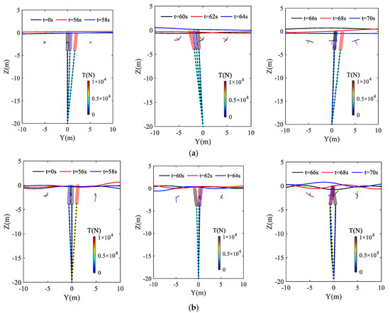The motion state of the slender cylinder and the tension distribution of mooring cable at different times under the two spectral conditions are shown in Figure 9, in which the velocity vector of the water particle at different times was marked with arrows in different colors. At the initial time (t = 0 s), the positions of the slender cylinder fastened by mooring cable in different wave model are same, and the mooring cables were not subject to tension. What calls for special attention is that the random numbers produced by random seeds (C++ computer language) in two wave models are same, i.e., the random numbers generated each time are the same. Only in this way can two wave models be compared. In a wave period, the motion state of the slender cylinder only has the translation motion in the y direction and the rolling motion in the X direction. The motion amplitude is between −2 m and +2 m. Due to the secondary peak frequency of the field spectrum, the rolling of slender cylinder in Figure 9b is obviously larger than that in Figure 9a, and the motion state is more complex. As a result, the maximum tension of Figure 9a,b are 5.5 kN and 13.0 kN, respectively. Therefore, the study of dynamic response of moored structures under typhoon waves will not be able to obtain the description of extreme cases only by using JONSWAP spectrum method.